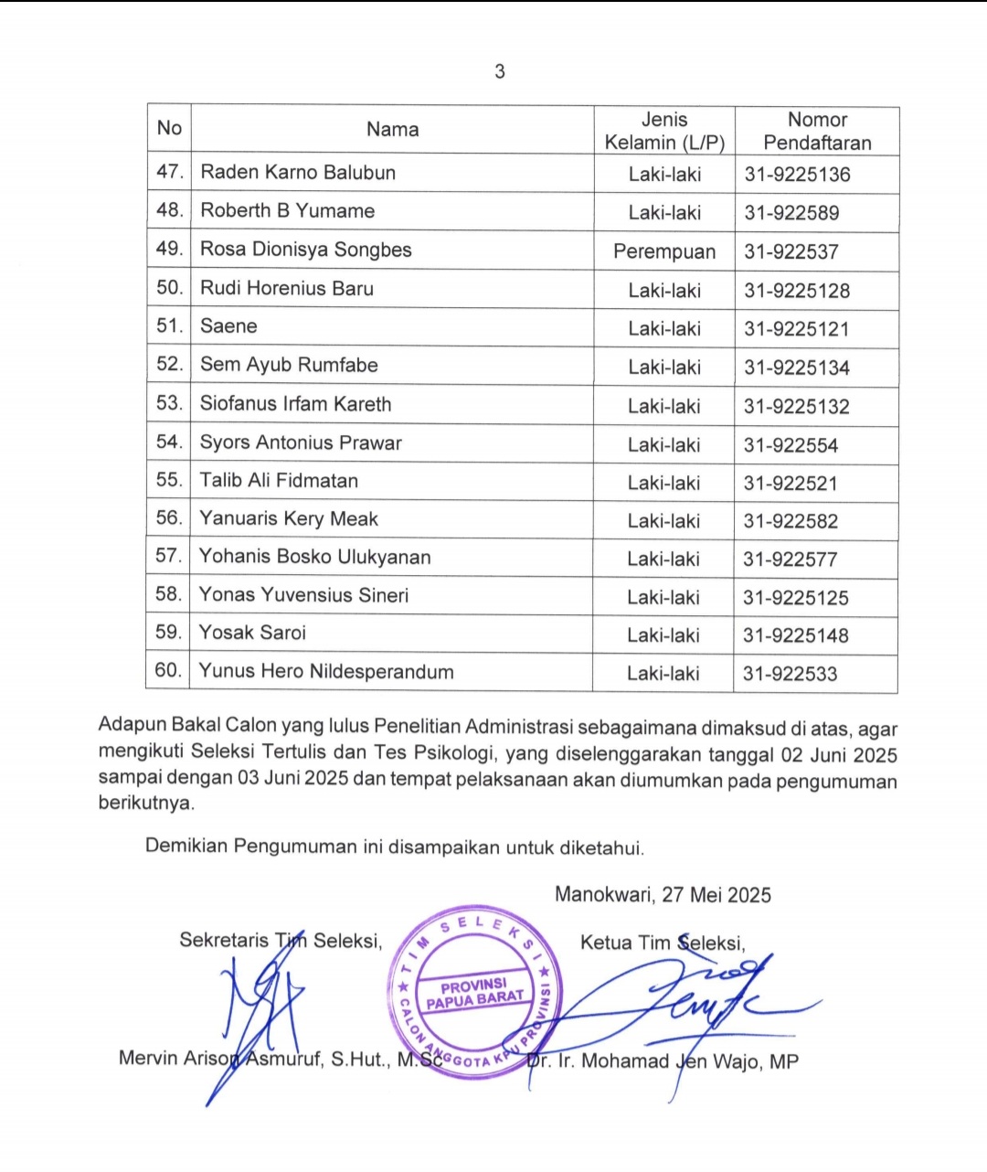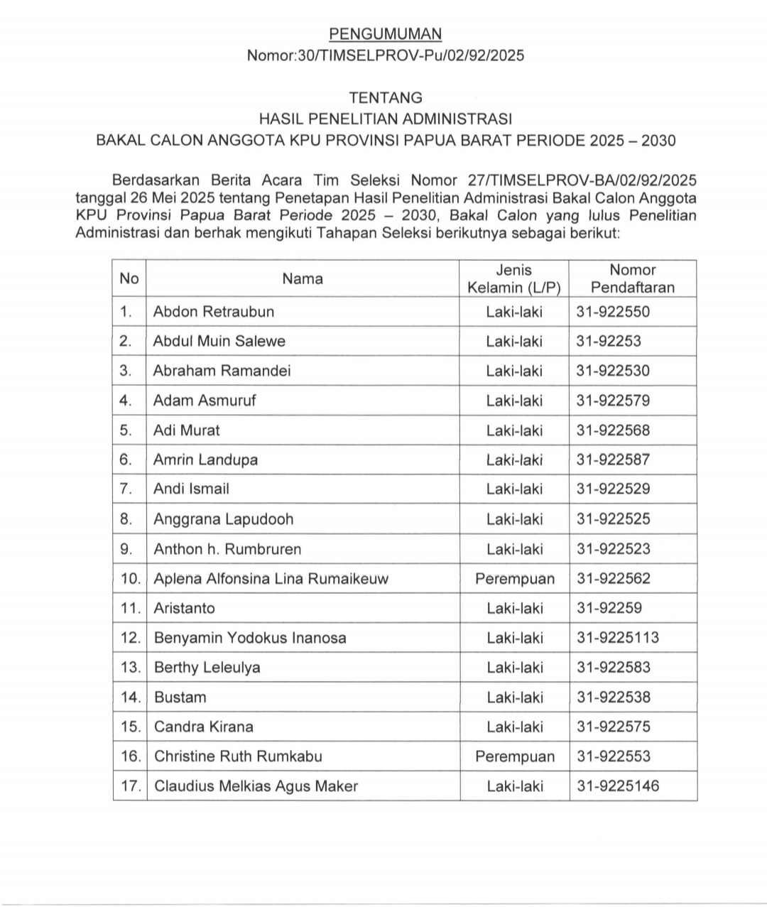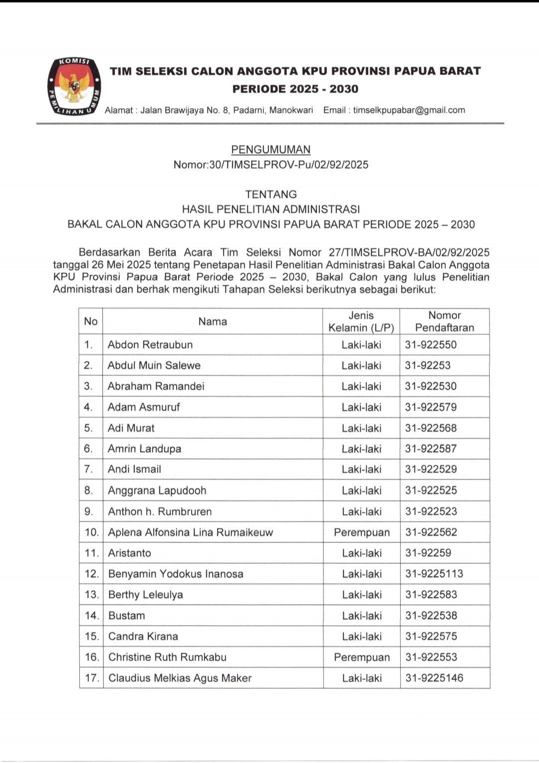 MANOKWARI – Sesuai Jadwal tahapan seleksi, tim seleksi Calon Komisioner Pemilihan Umum (KPU) Papua Barat mengumumkan peserta yang dinyatakan lolos administrasi.