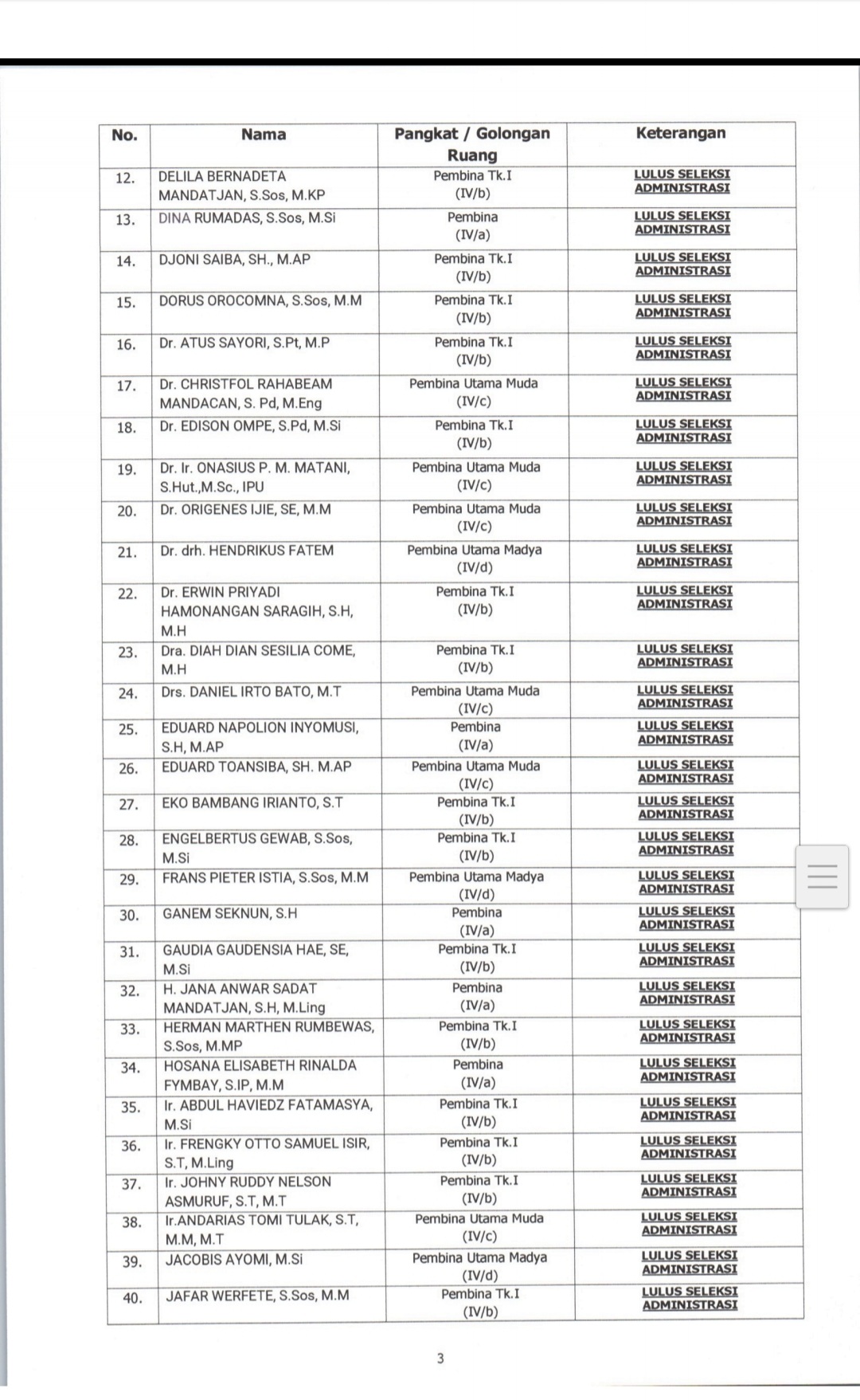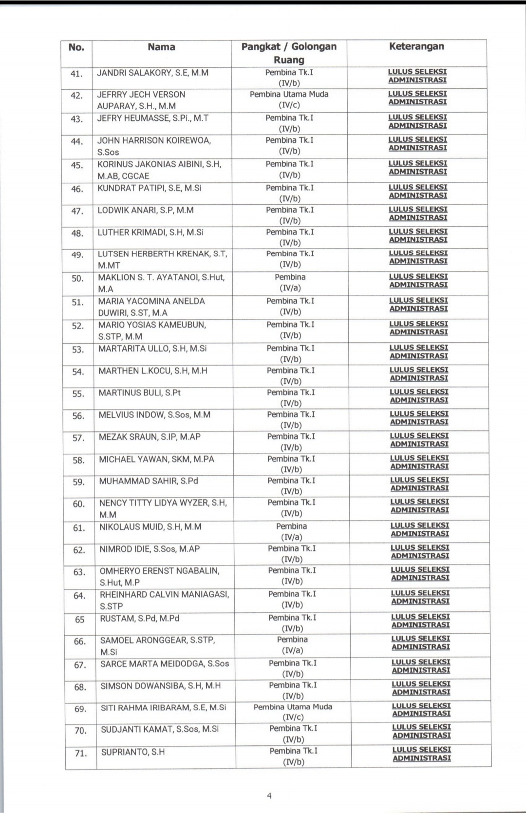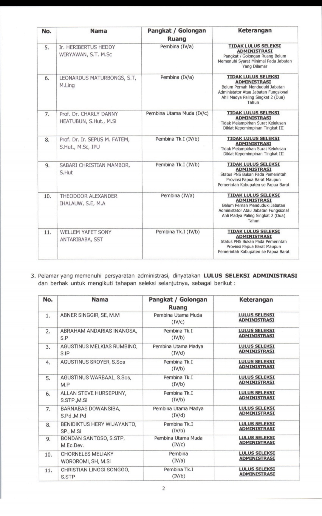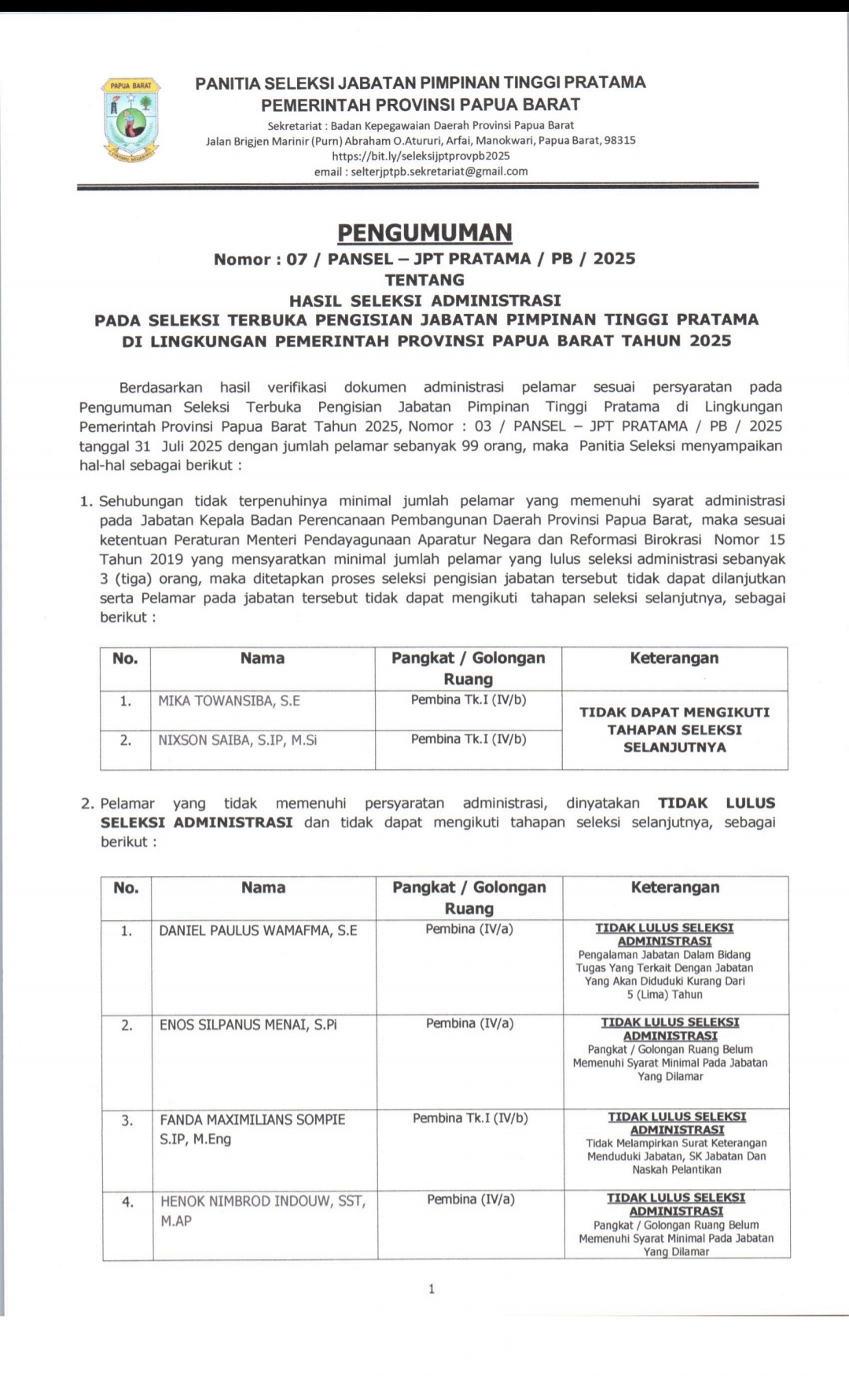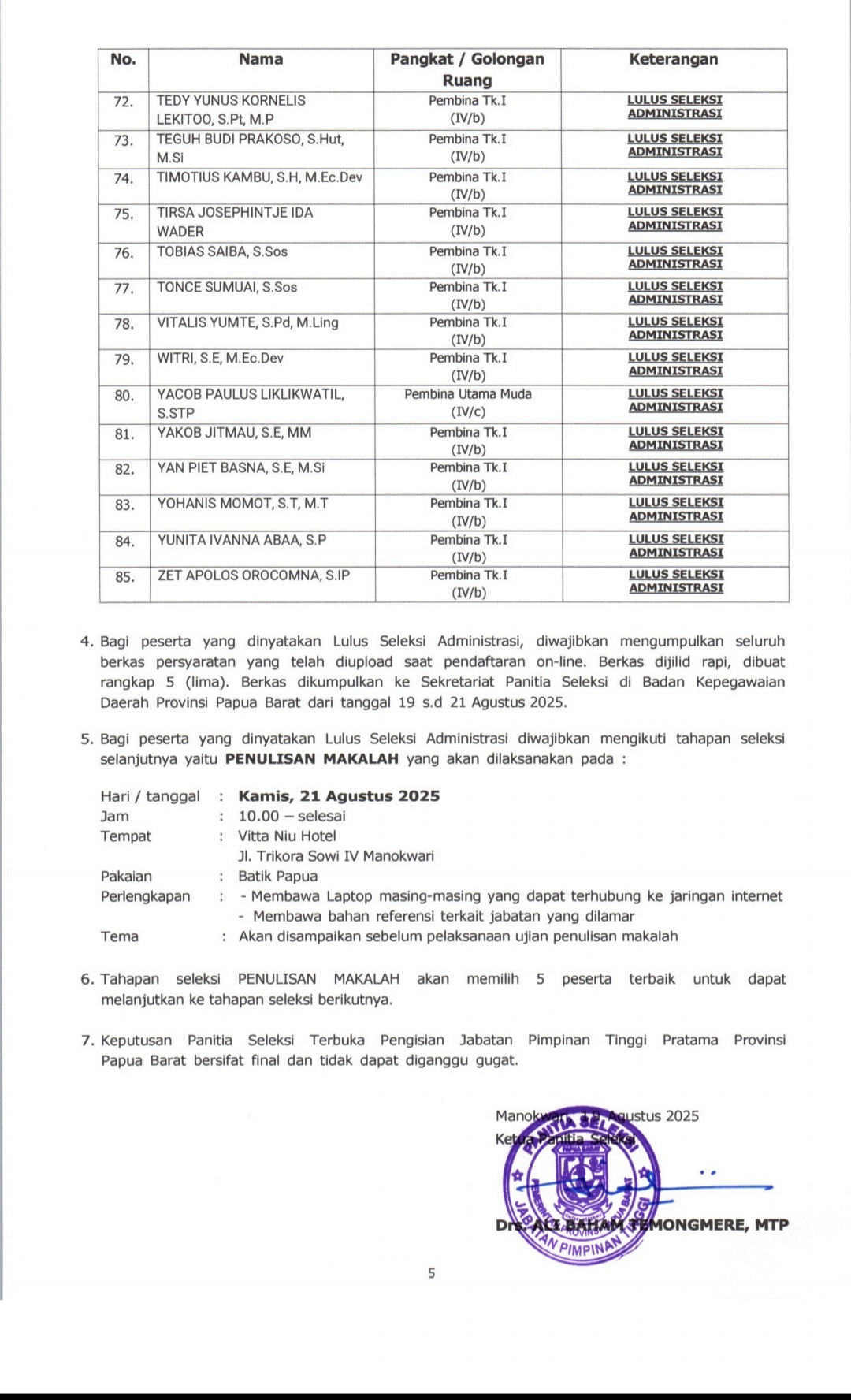 MANOKWARI – Panitia seleksi jabatan pimpinan tinggi pratama mengumumkan hasil seleksi administrasi pada seleksi terbuka pengisian Jabatan Pimpinan Tinggi Pratama di Lingkungan Pemerintah Papua Barat Tahun 2025.