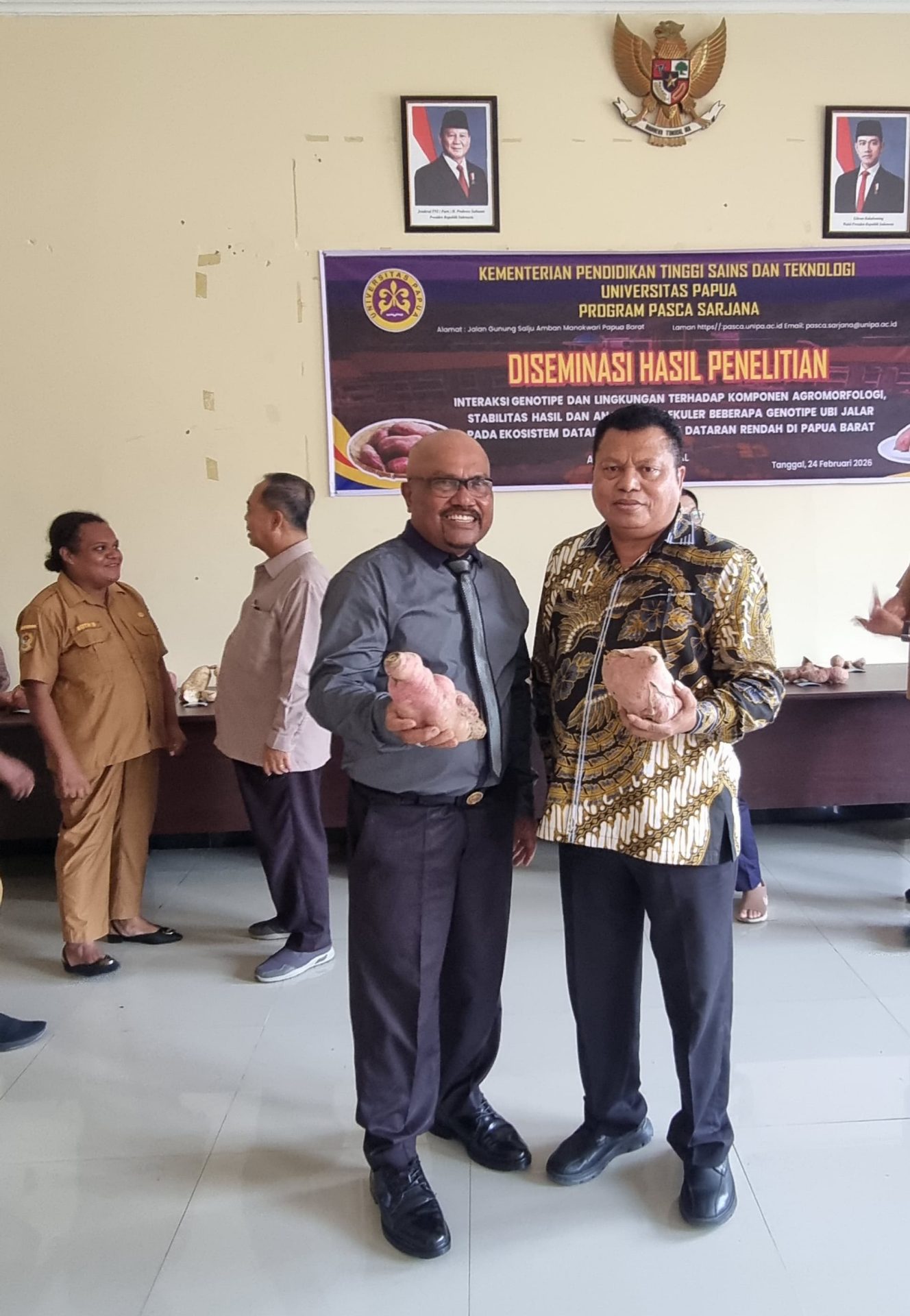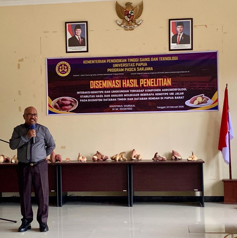 MANOKWARI, PAPUA BARAT – Agustinus Warbaal, Mahasiswa Program Pascasarjana Universitas Papua (UNIPA) Manokwari, melaksanakan diseminasi hasil penelitian berjudul Interaksi Genotipe dan Lingkungan terhadap Komponen Agromorfologi, Stabilitas Hasil, serta Analisis Molekuler Beberapa Genotipe Ubi Jalar pada Ekosistem Dataran Tinggi dan Dataran Rendah di Papua Barat, Selasa (24/2/2026).