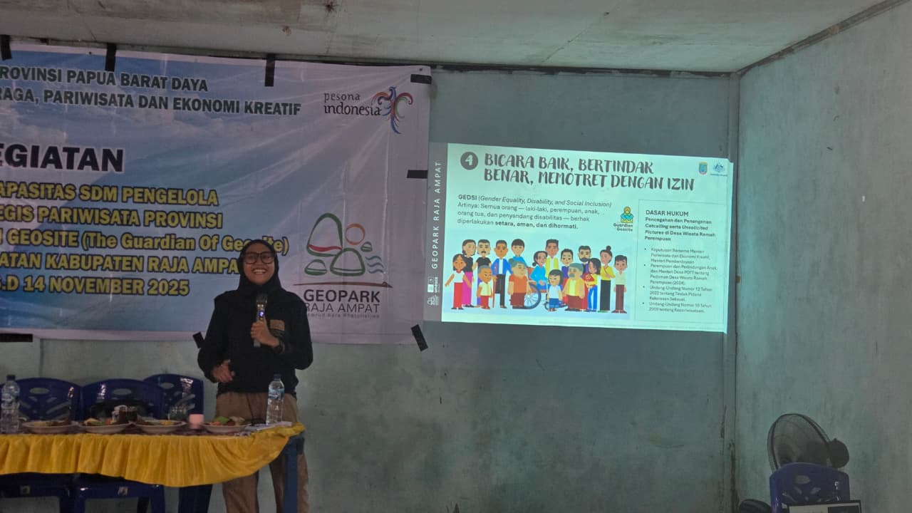“Evaluasi yang dilakukan pada dua kelompok pengelola dari dua destinasi yang berbeda di Raja Ampat ini menunjukkan hasil menarik. Masyarakat Misool yang sudah terbiasa menerima tamu memperlihatkan kesiapan GEDSI yang lebih baik, sementara Yefman sebagai calon destinasi baru masih berada pada tahap awal pembentukan sikap layanan. Pola ini sejalan dengan standar UNWTO yang menegaskan bahwa perubahan perilaku membutuhkan contoh, praktik, dan pembiasaan, bukan sekadar ceramah atau teori.” Ana R Septiana, M.Si ahli Ekologi Raja Ampat UNESCO Global Geopark yang langsung melakukan riset implementasi ini selepas menyelesaikan kursus Sustainable Tourism Short Course Indonesia, Fiji, and Solomon Island di Griffith University – Australia beberapa waktu lalu.