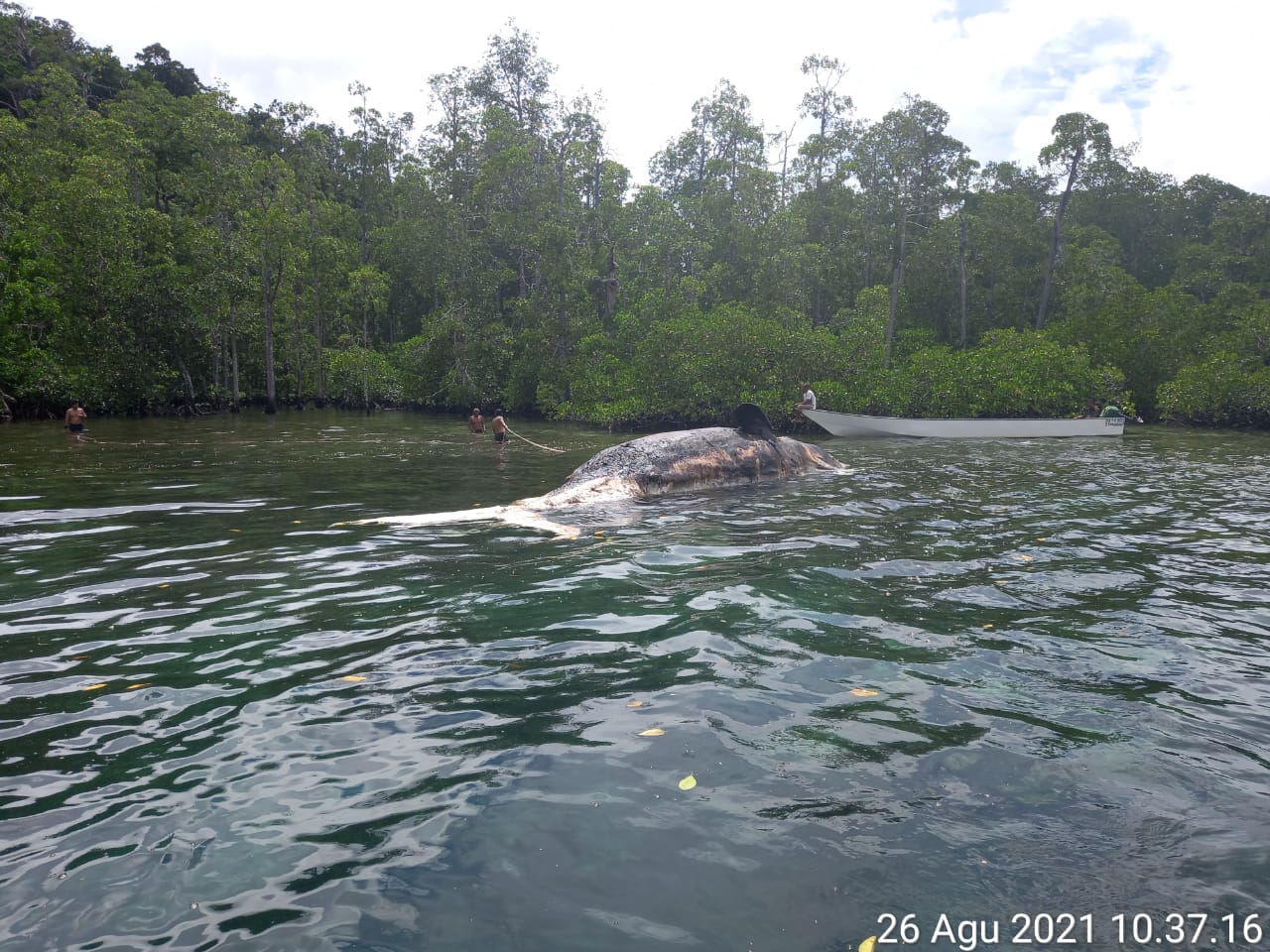 RAJA AMPAT, WAISAI – Tim Gabungan yang beranggotakan Dinas Perikanan Kota Sorong, perwakilan dari Loka PSPL Kota Sorong, dan dua orang masyarakat dari Kampung Sawinggrai bersama BLUD-UPTD Perikanan Provinsi Papua Barat mengevakuasi bangkai seekor paus yang ditemukan mati diperairan laut sekitar pulau Gam, tepatnya didepan Kordiris Homestay pada Kamis (26/08/2021) sore