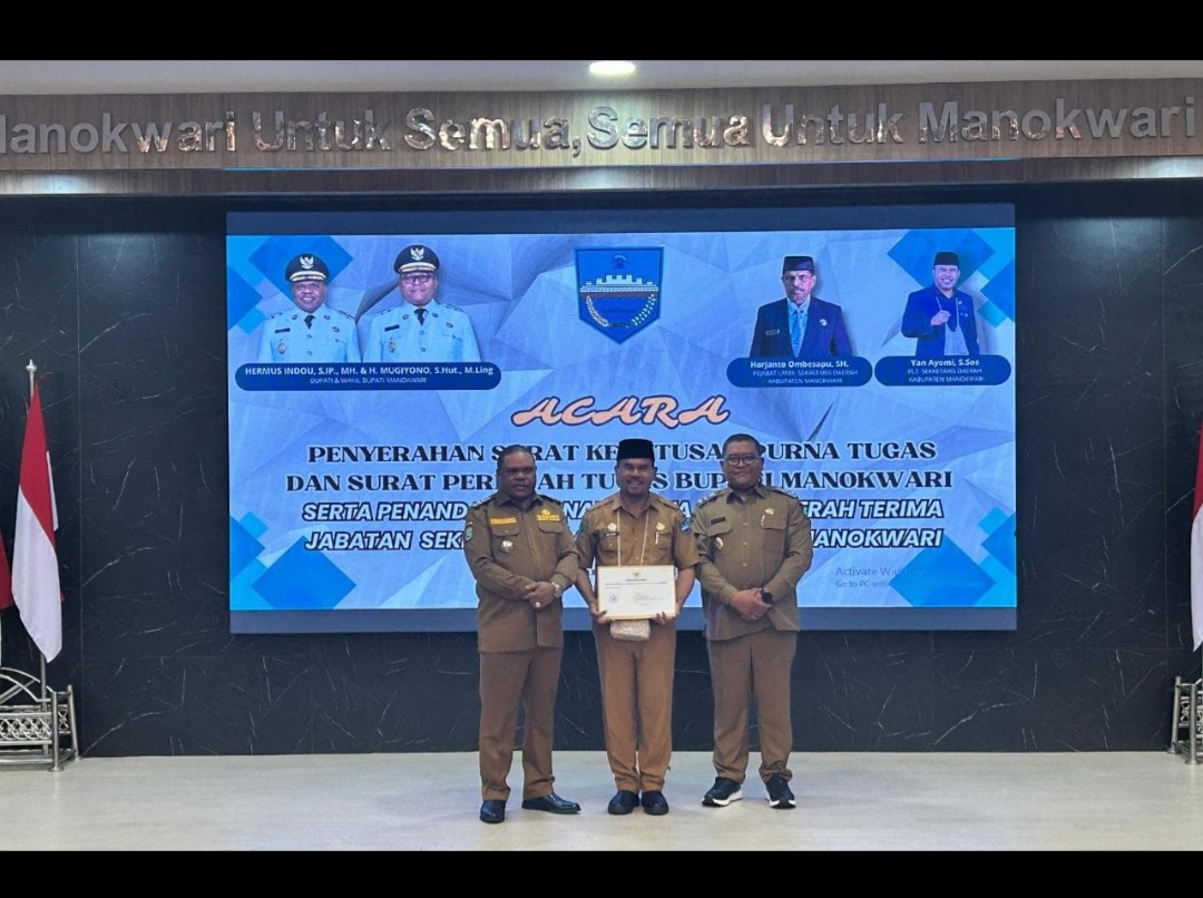 Yan Ayomi ditunjuk menggantikan Harjanto Ombesapu yang memasuki mada purna tugas. Penyerahan SK plt Sekda oleh Bupati didampingi Wakil Bupati Mugiyono dilaksanakan di Sasana Karya Kantor Bupati Manokwari, Senin (5/8/2025).