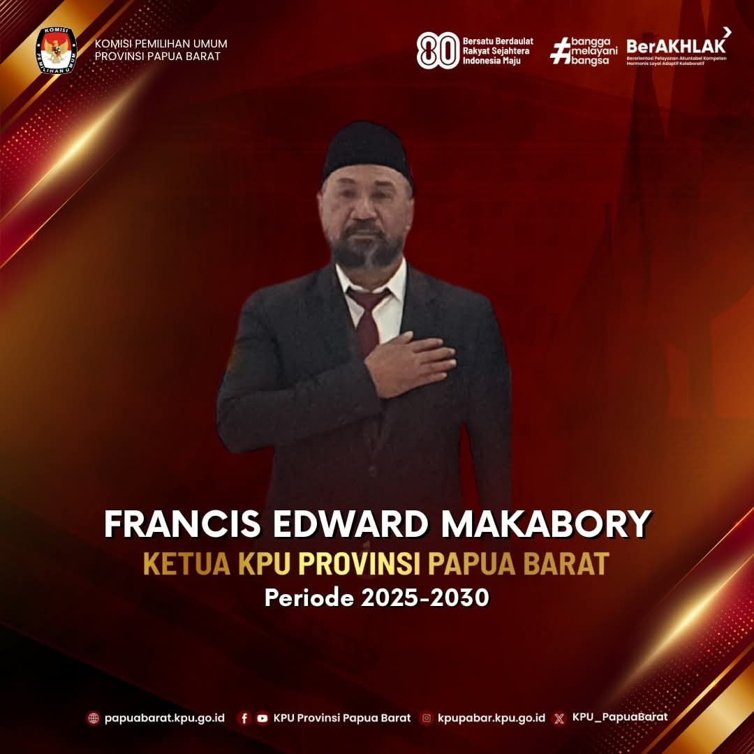 MANOKWARI – Komisioner Komisi Pemilihan Umum (KPU), Francis Makabory, terpilih menjadi Ketua KPU Papua Barat Periode 2025-2030. Penetapan ini dilakukan melalui pleno anggota KPU Papua Barat pada tanggal 4 Agustus 2025.