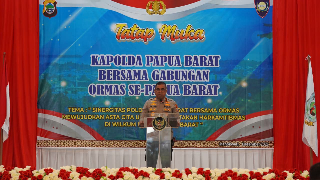 MANOKWARI – Polda Papua Barat melalui Direktorat Pembinaan Masyarakat (Binmas) menggelar kegiatan tatap muka antara Kapolda Papua Barat bersama gabungan organisasi kemasyarakatan (Ormas) se-Papua Barat, sebagai wadah memperkuat sinergitas dan kolaborasi dalam menjaga stabilitas keamanan dan ketertiban masyarakat di wilayah hukum Polda Papua Barat Rabu(10/12/25) bertempat di Hotel Aston Niu Manokwari.