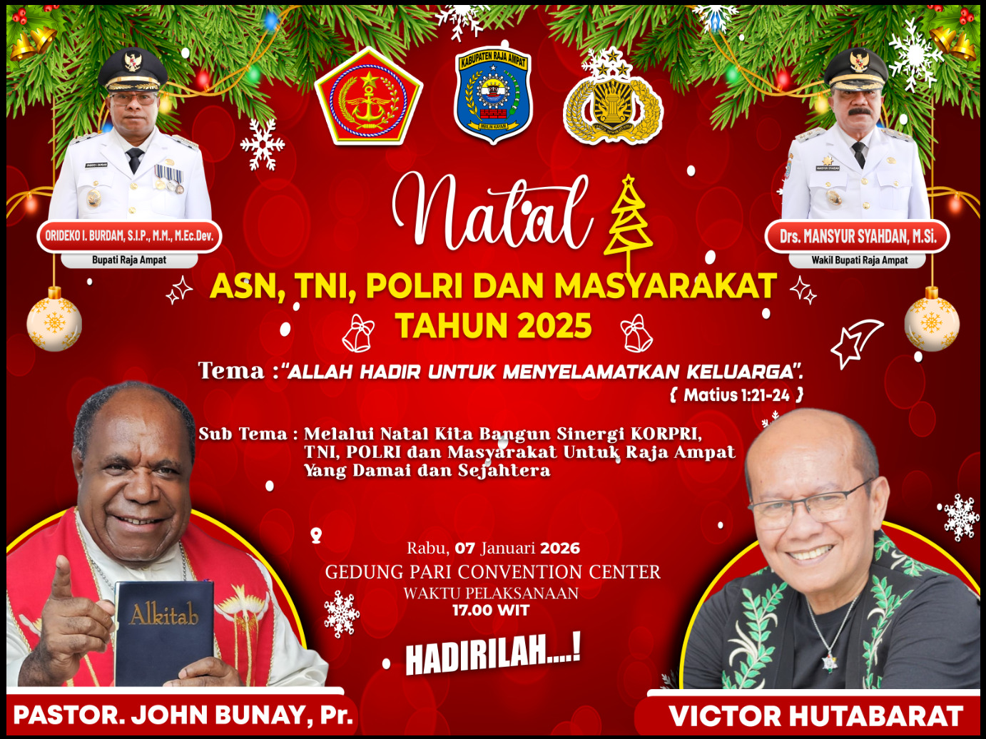 Ibadah dan perayaan Natal Gabungan dilaksanakan Rabu, 7 Januari 2026, bertempat di Gedung Pari Convention Center, mulai pukul 17.00 WIT. Kegiatan ini mengusung tema “Allah Hadir untuk Menyelamatkan Keluarga” (Matius 1:21–24), dengan subtema “Melalui Natal Kita Bangun Sinergi KORPRI, TNI, POLRI dan Masyarakat untuk Raja Ampat yang Damai dan Sejahtera.”