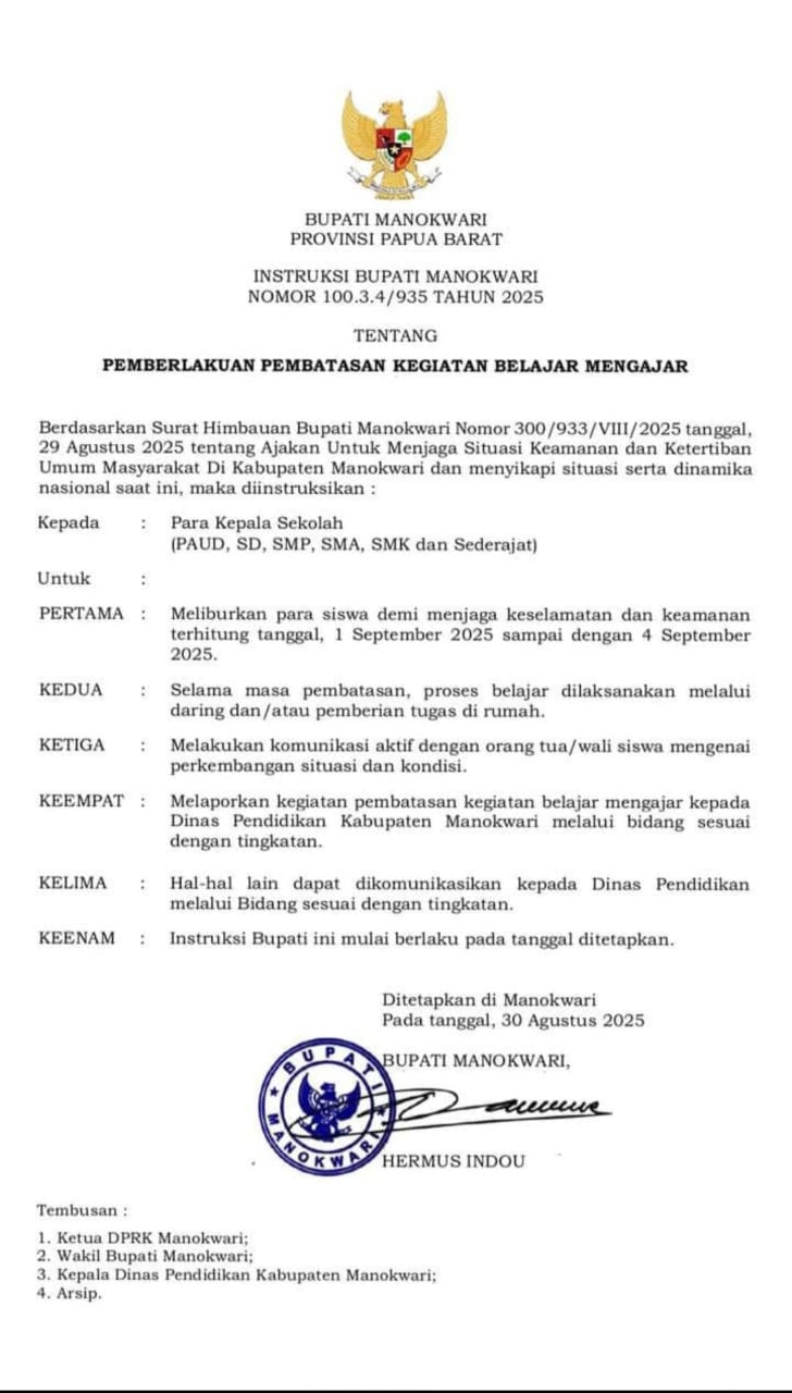 MANOKWARI – Bupati Manokwari, Hermus Indou mengeluarkan perlakuan pembatasan kegiatan belajar mengajar.