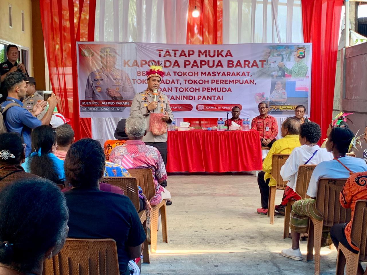 MANOKWARI – Polda Papua Barat berkolaborasi dengan Yayasan Rumbai Koteka mengadakan bakti sosial dan Tatap Muka bersama Tokoh Masyarakat, Tokoh Adat, Tokoh Perempuan, dan Tokoh Pemuda di Fanindi Pantai Manokwari. Selain itu, juga dilaksanakan pemeriksaan kesehatan gratis, sosialisasi pendidikan dan pemberian bantuan bahan pokok, Kamis (16/4/26).